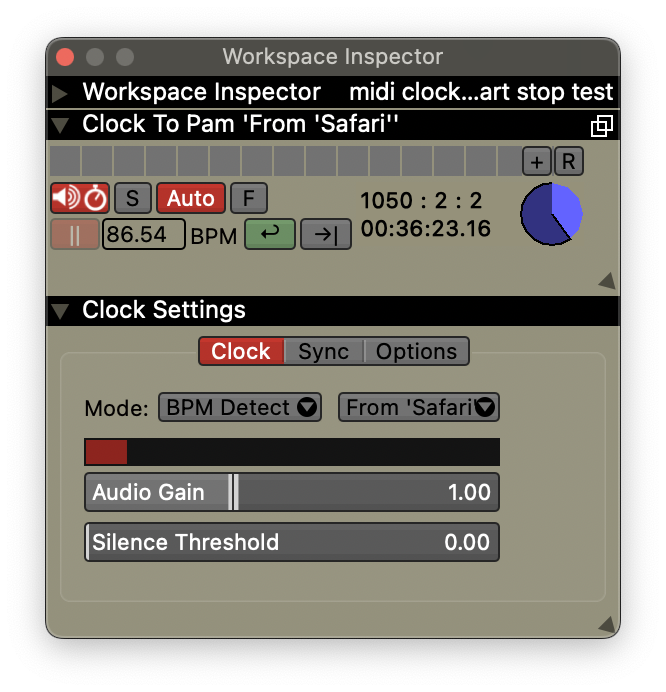 Once the basic setup for sending MIDI clock and Run messages from VDMX to a Eurorack clock is completed as described above, the automatic BPM Detection can be used to synchronize both clocks with the tempo of a real-time musical audio feed.